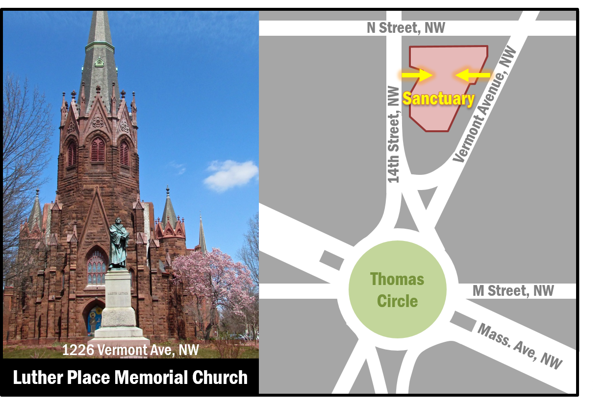 Entrance: Use the blue doors on either the 14th St NW side OR the Vermont Ave NW sides of the church.